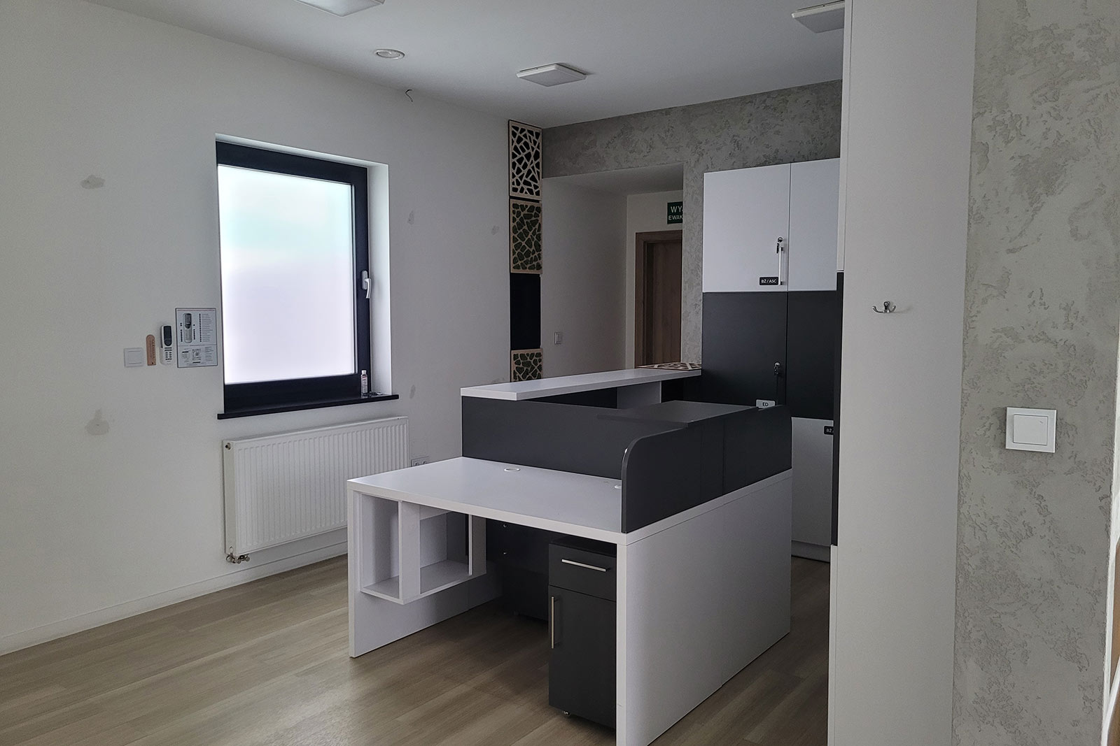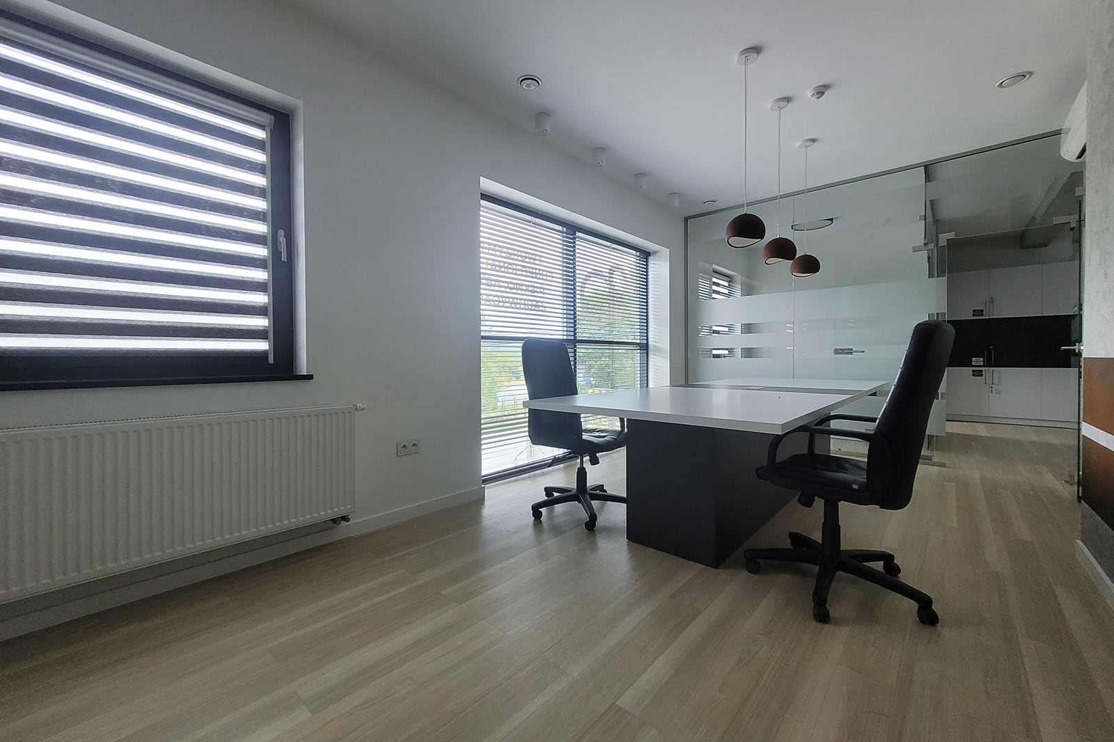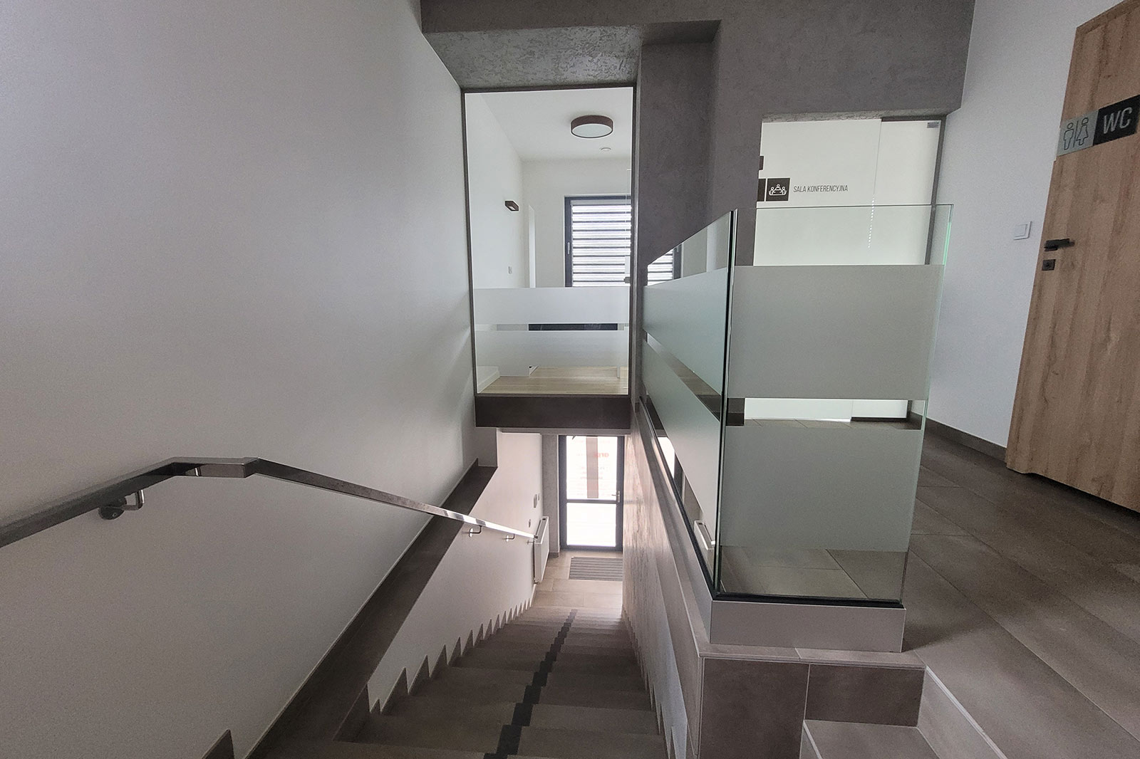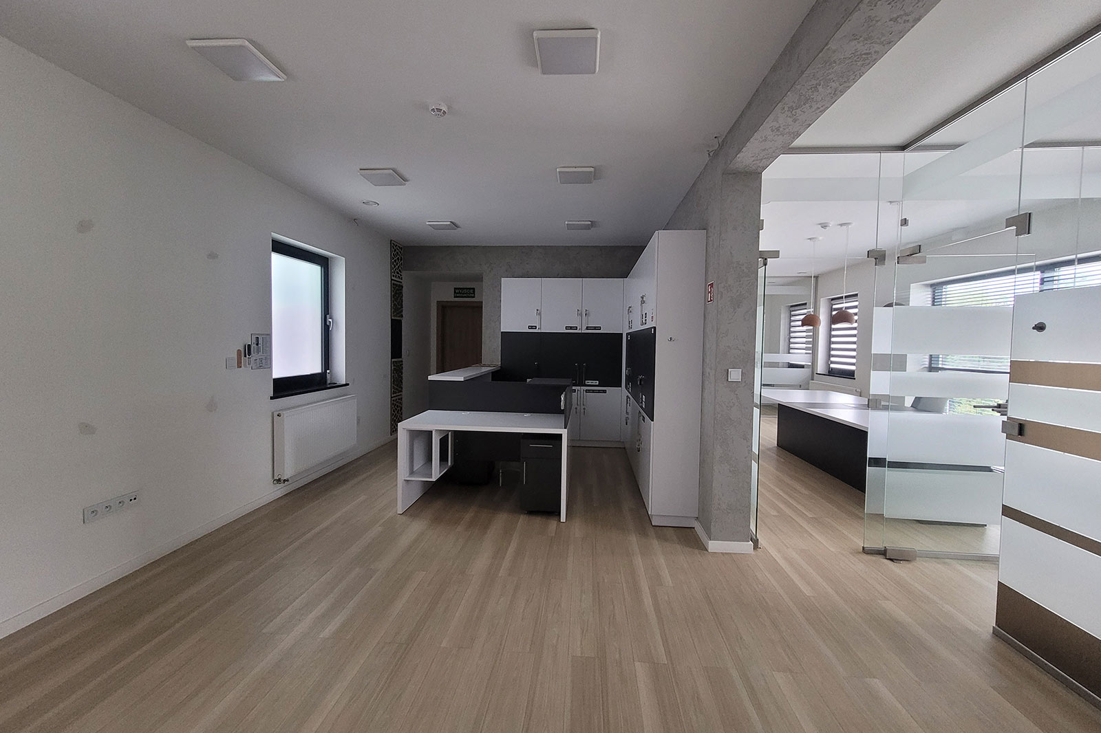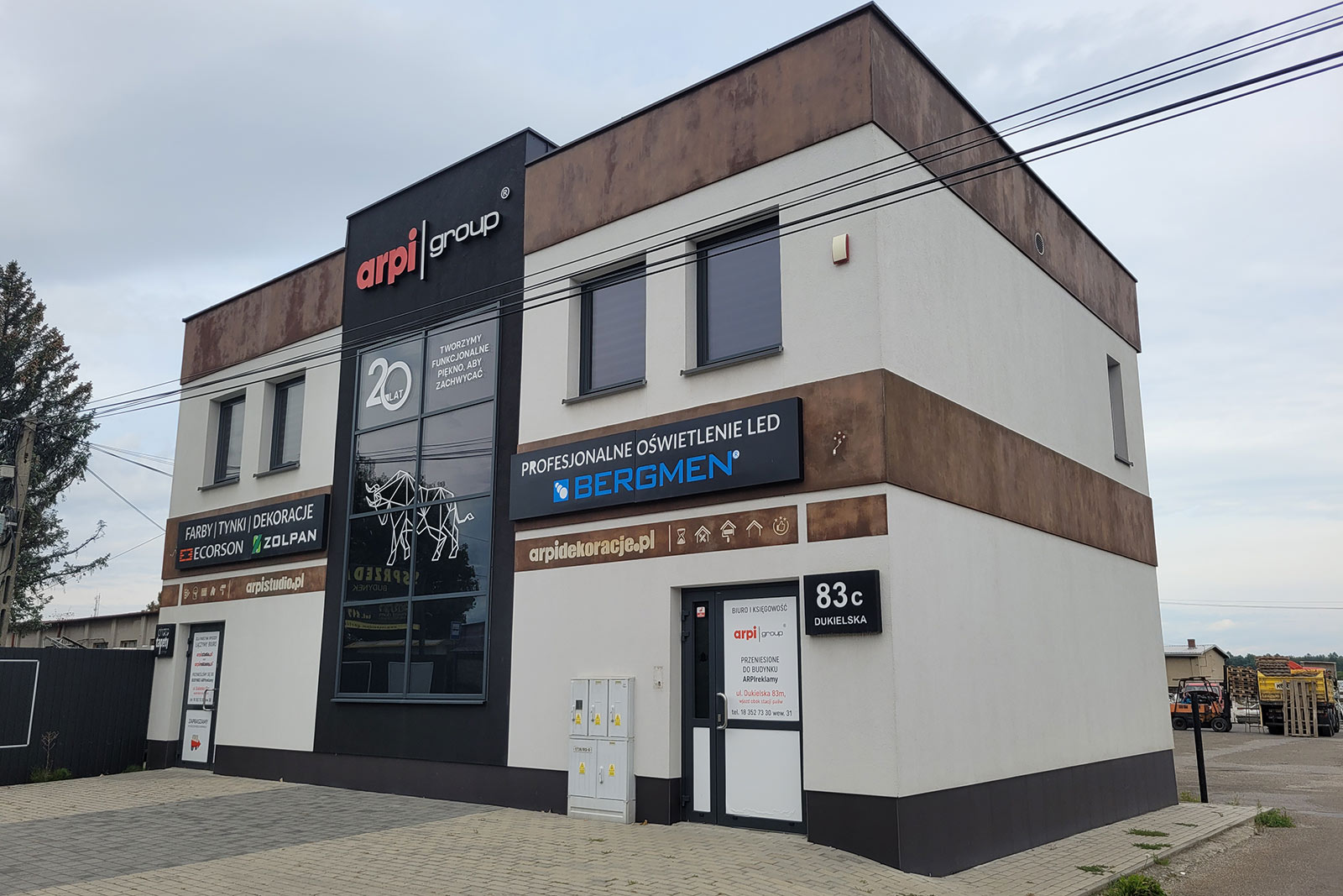 Przeszklenie daje więcej światła, a także elegancji przez co jest on zauważalny z daleka. Dwustronny parking daje komfort zarówno dla pracowników jak i klientów. Budynek posiada dwa wejścia z przodu oraz wejście z tyłu budynku. Na parterze znajdują się trzy pomieszczenia, natomiast przestronne piętro daje wiele możliwości, gdzie np. przeszklona sala nadaje się zarówno na sekretariat, gabinet jak i pokój zabaw dla dzieci. Kuchnia i łazienka na parterze jak i na piętrze.