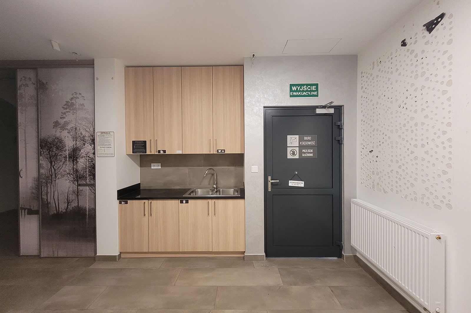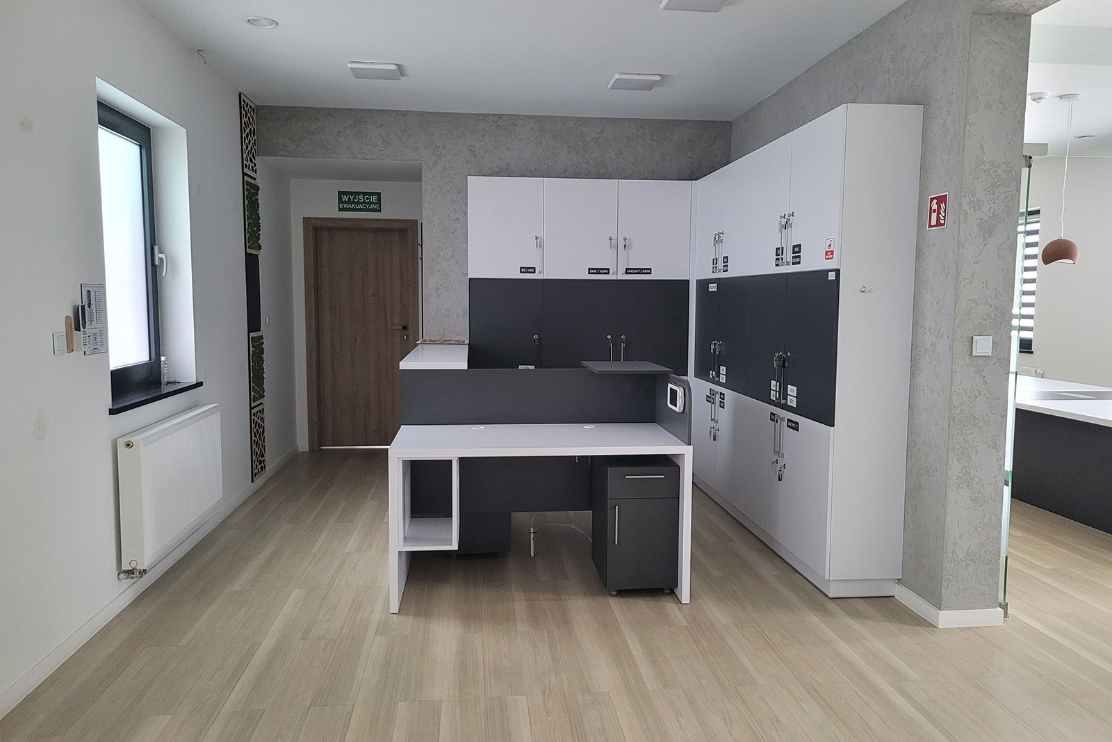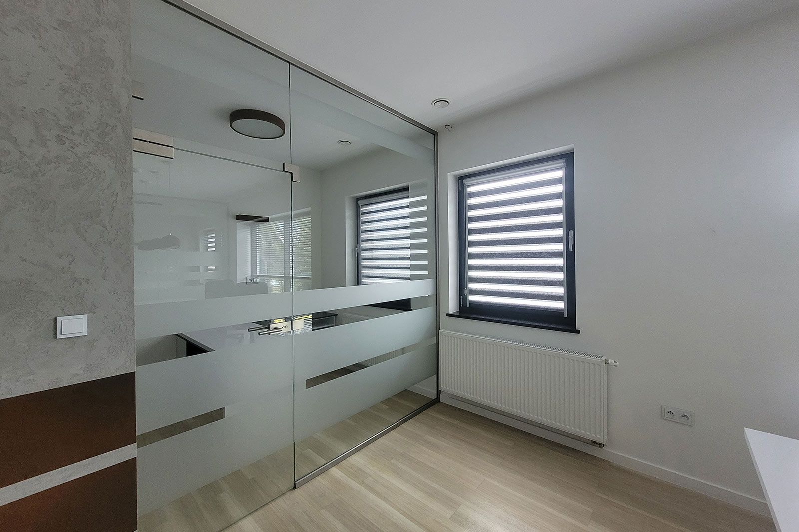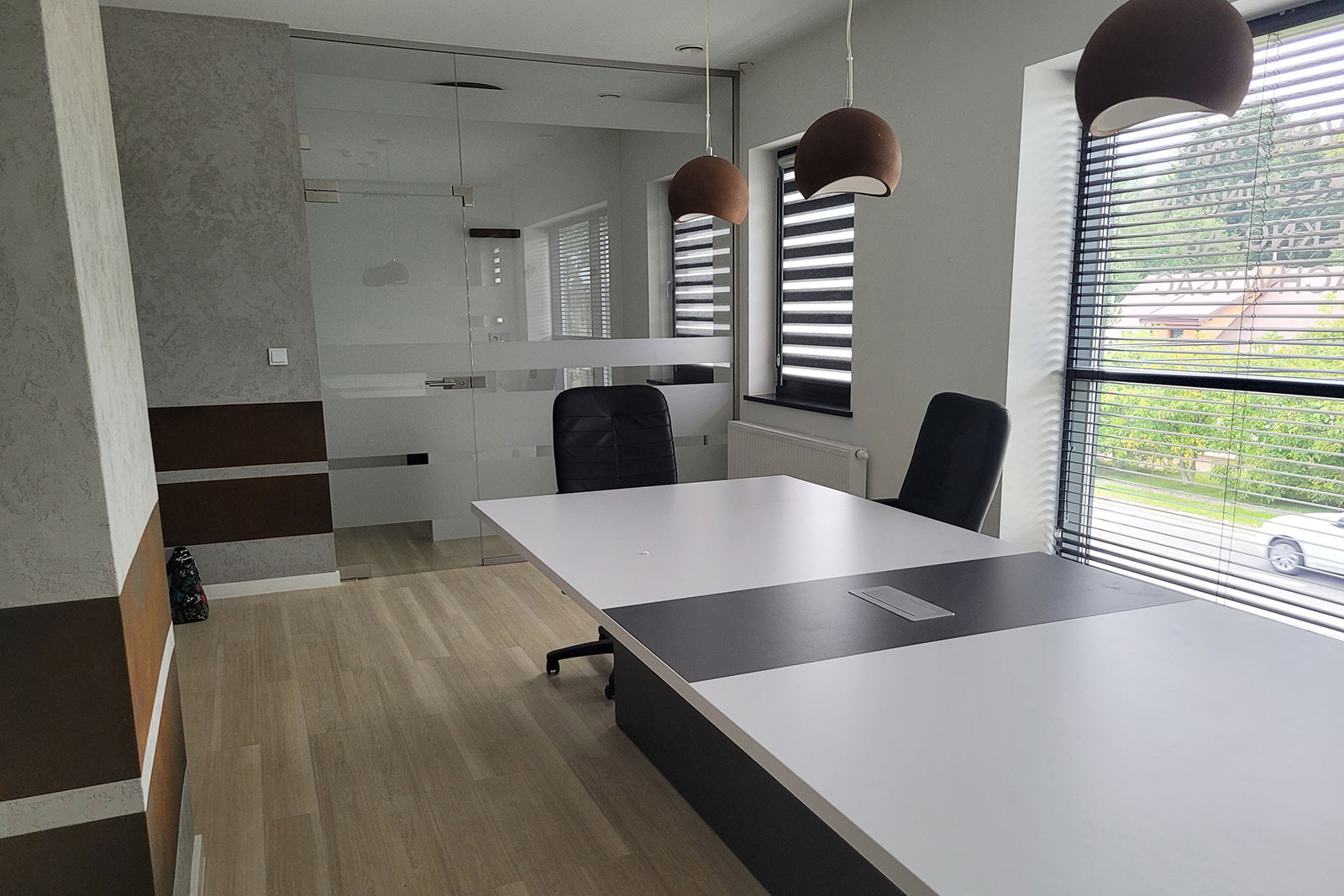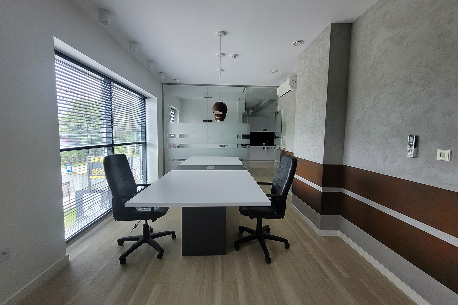 Przeszklenie daje więcej światła, a także elegancji przez co jest on zauważalny z daleka. Dwustronny parking daje komfort zarówno dla pracowników jak i klientów. Budynek posiada dwa wejścia z przodu oraz wejście z tyłu budynku. Na parterze znajdują się trzy pomieszczenia, natomiast przestronne piętro daje wiele możliwości, gdzie np. przeszklona sala nadaje się zarówno na sekretariat, gabinet jak i pokój zabaw dla dzieci. Kuchnia i łazienka na parterze jak i na piętrze.